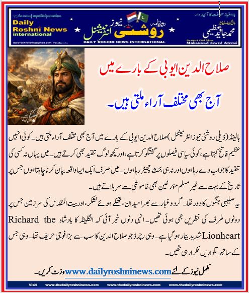 ہالینڈ(ڈیلی روشنی نیوز انٹرنیشنل )صلاح الدین ایوبی کے بارے میں آج بھی مختلف آراء ملتی ہیں۔ کوئی انہیں عظیم فاتح کہتا ہے، کوئی سیاسی فیصلوں پر گفتگو کرتا ہے، اور کچھ لوگ تنقید بھی کرتے ہیں۔ میں یہاں نہ کسی کی تنقید کا جواب دے رہا ہوں اور نہ ہی بحث چھیڑ رہا ہوں۔ میں صرف ایک ایسا واقعہ بیان کرنا چاہتا ہوں جس پر تاریخ کے بہت سے غیر مسلم مؤرخین بھی خاموشی سے سر ہلاتے ہیں۔