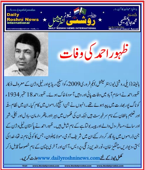 ہالینڈ(ڈیلی روشنی نیوز انٹرنیشنل )یکم فروری 2009ء کو اسٹیج ،ریڈیو اور ٹیلی وژن کے معروف فنکار ظہور احمد نے اسلام آباد میں وفات پائی اور وہیں آسودۂ خاک ہوئے۔ ظہور احمد 18 ستمبر 1934ء کو ناگ پور بھارت میں پیدا ہوئے تھے۔ انہوں نے جن اسٹیج ڈراموں میں کام کیا۔ ان میں نظام سقّہ اور تعلیم بالغان کے نام سرفہرست ہیں جبکہ ان کی فلموں میں ہیرا اور پتھر، ارمان، بادل اور بجلی، شہر اور سائے، مسافر، دل والے اور پیسہ بولتا ہے کے نام شامل ہیں۔ ظہور احمد نے پاکستان ٹیلی وژن کے جن ڈراموں میں یادگار کردار کئے ان میں شریف آدمی، مولا پہلوان، جس کا کوئی نام نہ تھا، خدا کی بستی، دیواریں، چنگیز خان، نور الدین زنگی، پردیس،آہن اور آخری چٹان کے نام خصوصاً قابل ذکر ہیں۔