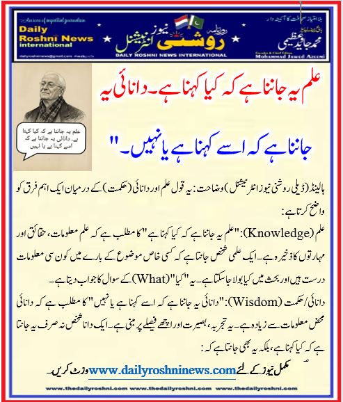 ہالینڈ(ڈیلی روشنی نیوز انٹرنیشنل ) وضاحت:یہ قول علم اور دانائی (حکمت) کے درمیان ایک اہم فرق کو واضح کرتا ہے: