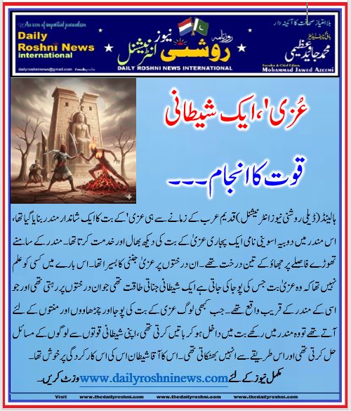 ہالینڈ(ڈیلی روشنی نیوز انٹرنیشنل )قدیم عرب کے زمانے سے ہی عزی’ کے بت کا ایک شاندار مندر بنایا گیا تھا، اس مندر میں دوبیہ اسوینی نامی ایک پجاری عزیٰ کے بت کی دیکھ بھال اور خدمت کرتا تھا۔ مندر کے سامنے تھوڑے فاصلے پر جھاؤ کے تین درخت تھے۔ ان درختوں پر عزیٰ جننی کا بسیرا تھا۔ اس بارے میں کسی کو علم نہیں تھا کہ وہ عزیٰ بت جس کی پوجا کی جاتی ہے ایک شیطانی جناتی طاقت تھی جو ان درختوں پر رہتی تھی اور جو اسی کے مندر کے قریب واقع تھے۔ جب کبھی لوگ عزی کے بت کی پوجا اور چڑھاووں اور منتوں کے لئے آتے تھے تو وہ مندر میں رکھے بت میں داخل ہو کر باتیں کرتی تھی،  اپنی شیطانی قوتوں سے لوگوں کے مسائل حل کرتی تھی اور اس طریقے سے انہیں بھٹکاتی تھی۔ اس کا آقا شیطان اس کی اس کارکردگی پر خوش تھا۔