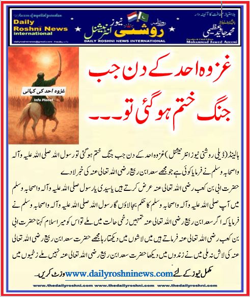 ہالینڈ(ڈیلی روشنی نیوز انٹرنیشنل )غزوہ احد کے دن جب جنگ ختم ہو گئی تو رسول الله صلی الله علیہ وآلہ واصحابہ وسلم نے فرمایا کوئی ہے جو مجھے سعد ابن ربیع رضی الله تعالی عنہ کی خبر لا دے