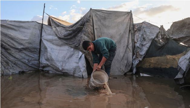 لاکھوں فلسطینی اس وقت غزہ کے ساحلی علاقوں میں خیموں میں رہنے پر مجبور ہیں،  تیز ہواؤں نے ہزاروں خیموں کو اکھاڑ دیا ہے یا وہاں بارش کا پانی بھرگیا ہے۔