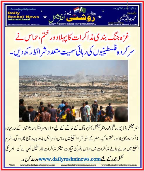 انٹرنیشنل (ڈیلی روشنی نیوز انٹرنیشنل )غزہ جنگ کے خاتمے کے لیے حماس اسرائیل اور  ثالثوں  کے درمیان مذاکرات کا پہلا دور ختم ہوگیا۔ مصر کے شہر شرم الشیخ میں حماس ، اسرائیل بات چیت آج  پھر ہو گی۔