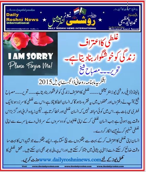 ہالینڈ(ڈیلی روشنی نیوزانٹرنیشنل ۔۔۔۔ غلطی کا اعتراف زندگی کو خوشگوار بنا دیتا ہے۔۔۔ تحریر۔۔۔مصباح شیخ)آپ نے دفتروں اور محفلوں میں یہ فقرہ سنا ہو گا کہ انسان خطا کا پتلا ہے، اس سے غلطی کا سرزد ہونا ایک فطری سی بات ہے۔ اس میں کوئی مبالغہ نہیں کہ انسان غلطی اور خطا کرتا ہے۔ لیکن زیادہ خرابی اور گڑبڑ اس وقت پیدا ہوتی ہے جب انسان 1 غلطی کر کے اپنی غلطیوں کو دوسروں کے سر ڈال دے یا سرے سے اپنی غلطی تسلیم کرنے ہیسے انکار کر دے۔