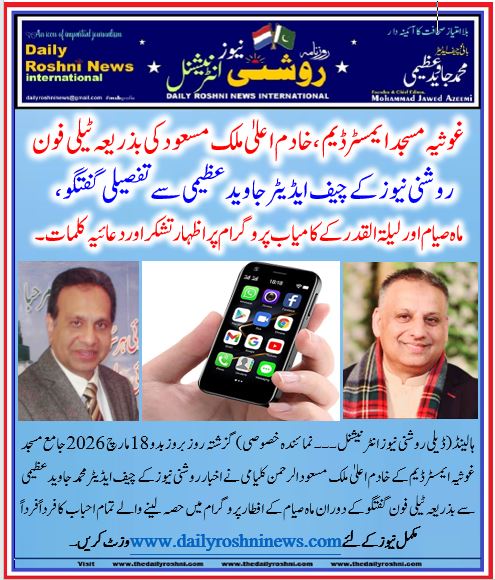 ہالینڈ(ڈیلی روشنی نیوز انٹر نیشنل۔۔۔ نمائندہ خصوصی) گزشتہ روز بروز بدو 18 ما رچ 2026 جامع مسجد غوثیہ ایمسٹر ڈیم کے خادم اعلیٰ ملک مسعود الرحمن کلیا می نے اخبار روشنی نیوز کے چیف ایڈیٹرمحمد جاوید عظیمی سے بذریعہ ٹیلی فون گفتگو کے دوران  ماہ صیام کے افطار پروگرام میں حصہ لینے والے تمام احباب کا فرداً فرداً تذکرہ کرتے ہوئے ان تمام کا بھر پور تعاون کرنے پر شکریہ ادا کیا۔ ملک مسعود نے لیلتہ القدر کی خصوصی روحانی ، بابرکت تقریب کے کامیاب انعقاد پر مسرت کا اظہار کیا۔ مذکورہ پروگرام میں کمیونٹی کے لئے خدمات  سرانجام دینے  والی نمایاں شخصیات غلام حسین کیانی ، ملک منظور، حاجی طارق ، سلیم بٹ، علی رانا، سہیل احمد اور اخبار روشنی نیوز انٹرنیشنل کے چیف ایڈیٹر محمد جاوید عظیمی کو غوثیہ مسجد ایمسٹر ڈیم کی جانب سے اعزازی شیلڈز پیش کی  گئیں ۔ ان تمام معزز حضرات کو میں صمیم قلب سے مبارکباد پیش کرتا ہوں اور اُمید کرتا ہوں کہ مستقبل میں بھی ان سب کا تعاون جاری رہے گا ۔ گفتگو کے دوران جاوید عظیمی نے کہا رمضان المبارک میں افطاریوں اور لیلتہ القدر  کی بابرکت تقریب کے کامیاب انعقاد پر ملک مسعود اور دیگر اراکین کو دل کی اتھاہ گہرائیوں سے مبارکباد پیش کی ، مزید کہا کہ بلاشہ اس وقت جامع مسجد غوثیہ ایمسٹرڈیم انتظام و انصرام اور کمیونٹی کی خدمات کے حوالے سے نمبر(ون ) پر ہے ۔ یاد رہے لیلتہ القدر کی یاد گار کامیاب ترین تقریب کے  لئے دی ہیگ کی کاروباری اور سماجی شخصیت راجہ عابد مہمان خصوصی تھے۔ ایک موقعہ پر گفتگو کے دوران ملک  مسعود نے مسرت و انبساط کی کیفیت میں بتایا کہ لیلتہ القدر کی تقریب کے لئے انگلینڈ سے مٹھائی منگوائی  گئی جو شرکائے تقریب کو پیش کی گئی۔ آخر میں ملک مسعود نے جاوید عظیمی کا متذکرہ تقریب میں شرکت کرنے پر صمیم قلب شکریہ ادا کرتے ہوئے دعائیہ کلمات بھی ادا کئے۔