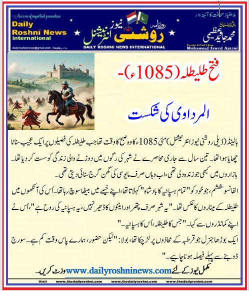 ہالینڈ(ڈیلی روشنی نیوز انٹرنیشنل )مئی 1085ء کا وہ صبح کا وقت تھا جب طلیطلہ کی فصیلوں پر ایک عجیب سناٹا چھایا ہوا تھا۔ تین سال سے جاری محاصرے نے شہر کی رگوں میں دوڑنے والی زندگی کو سست کر دیا تھا۔ بازاروں میں کبھی جو زندہ دلی تھی، اب وہاں صرف مایوسی کی گھن گرج سنائی دیتی تھی۔