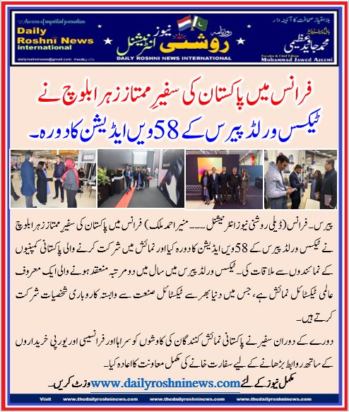 پیرس۔   فرانس(ڈیلی روشنی نیوز انٹرنیشنل  ۔۔۔ منیر احمد ملک)        فرانس میں پاکستان کی سفیرِ ممتاز زہرا بلوچ نے ٹیکس ورلڈ پیرس کے 58ویں ایڈیشن کا دورہ کیا اور نمائش میں شرکت کرنے والی پاکستانی کمپنیوں کے نمائندوں سے ملاقات کی۔ٹیکس ورلڈ پیرس میں سال میں دو مرتبہ منعقد ہونے والی ایک معروف عالمی ٹیکسٹائل نمائش ہے، جس میں دنیا بھر سے ٹیکسٹائل صنعت سے وابستہ کاروباری شخصیات شرکت کرتے ہیں۔