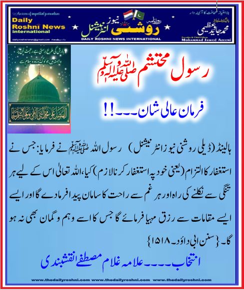 ہالینڈ(ڈیلی روشنی نیو زانٹرنیشنل) رسول اللہ ﷺ نے فرمایا:‏جس نے استغفار کا التزام ( یعنی خود پہ استغفار کرنا لازم ) کیا، اللہ تعالیٰ اس کے لیے ہر تنگی سے نکلنے کی راہ اور ہر غم سے راحت کا سامان پیدا فرما دے گا اور ایسے ایسے مقامات سے رزق مہیا فرمائے گا جس کا اسے وہم و گمان بھی نہ ہو گا۔‏{سنن ابی داؤد۔۱۵۱۸}