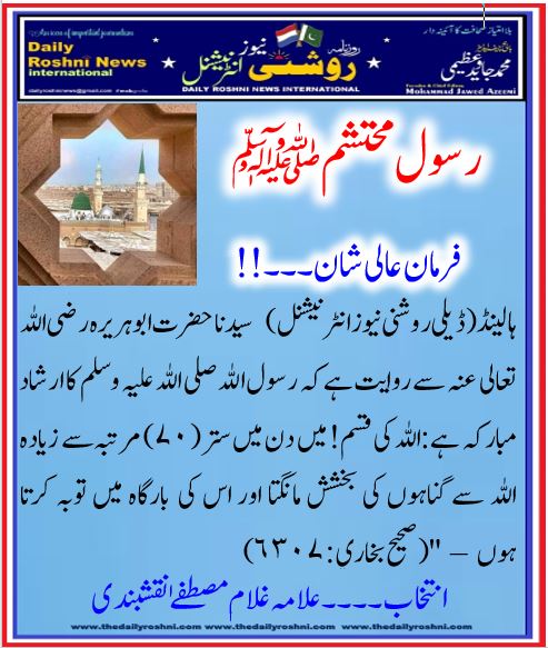 ہالینڈ(ڈیلی روشنی نیو زانٹرنیشنل) سیدنا حضرت ابو ہریرہ رضی اللہ تعالی عنہ سے روایت ہے کہ رسول اللہ صلی اللہ علیہ وسلم کا ارشاد مبارکہ ہے:اللہ کی قسم! میں دن میں ستر (٧٠) مرتبہ سے زیادہ اللہ سے گناہوں کی بخشش مانگتا اور اس کی بارگاہ میں توبہ کرتا ہوں” – (صحیح بخاري : ٦٣٠٧)