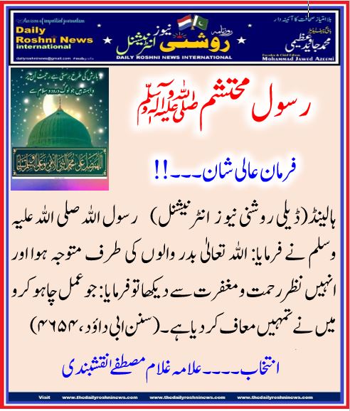 ہالینڈ(ڈیلی روشنی نیو ز انٹرنیشنل) رسول اللہ صلی اللہ علیہ وسلم نے فرمایا: اللہ تعالیٰ بدر والوں کی طرف متوجہ ہوا اور انہیں نظر رحمت و مغفرت سے دیکھا تو فرمایا: جو عمل چاہو کرو میں نے تمہیں معاف کر دیا ہے ۔ (سنن ابی داؤد،۴۶۵۴)