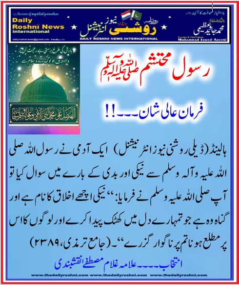 ہالینڈ(ڈیلی روشنی نیو زانٹرنیشنل) ایک آدمی نے رسول اللہ صلی اللہ علیہ وآلہ وسلم سے نیکی اور بدی کے بارے میں سوال کیا تو آپ صلی اللہ علیہ وسلم نے فرمایا: “ نیکی اچھے اخلاق کا نام ہے اور گناہ وہ ہے جو تمہارے دل میں کھٹک پیدا کرے اور لوگوں کا اس پر مطلع ہونا تم پر ناگوار گزرے“ ۔ (جامع ترمذی، ۲۳۸۹)
