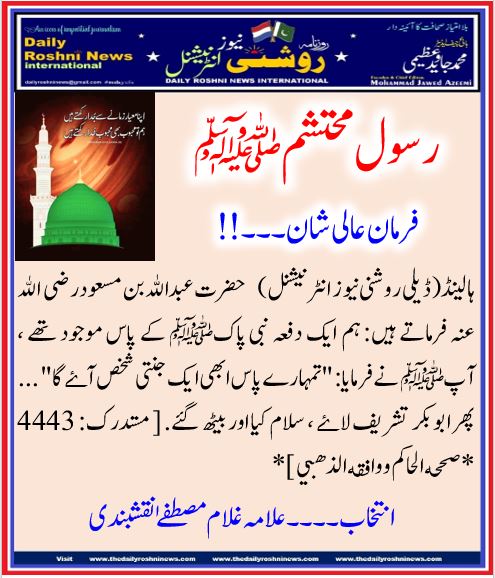 ہالینڈ(ڈیلی روشنی نیو ز انٹرنیشنل) حضرت عبداللہ بن مسعود رضی الله عنہ فرماتے ہیں: ہم ایک دفعہ نبی پاکﷺ کے پاس موجود تھے ، آپﷺ نے فرمایا: “تمہارے پاس ابھی ایک جنتی شخص آۓ گا” … پھر ابوبکر تشریف لاۓ ، سلام کیا اور بیٹھ گئے. [ مستدرک: 4443 *صححه الحاكم ووافقه الذهبي ]*