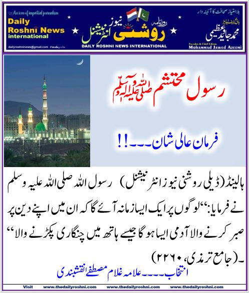 فرمان عالی شان۔۔۔!! / ہالینڈ کی خبریں, فرمان رسول / By Daily Roshni News ہالینڈ(ڈیلی روشنی نیو زانٹرنیشنل) رسول اللہ صلی اللہ علیہ وسلم نے فرمایا:“لوگوں پر ایک ایسا زمانہ آئے گا کہ ان میں اپنے دین پر صبر کرنے والا آدمی ایسا ہو گا جیسے ہاتھ میں چنگاری پکڑنے والا“ ۔(جامع ترمذی،۲۲۶۰)