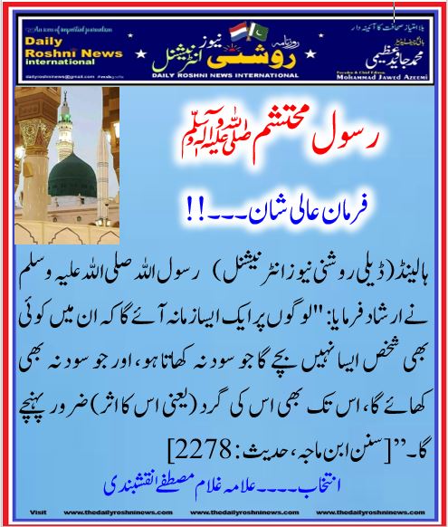 ہالینڈ(ڈیلی روشنی نیو زانٹرنیشنل) رسول اللہ صلی اللہ علیہ وسلم نے ارشاد فرمایا: “لوگوں پر ایک ایسا زمانہ آئے گا کہ ان میں کوئی بھی شخص ایسا نہیں بچے گا جو سود نہ کھاتا ہو، اور جو سود نہ بھی کھائے گا، اس تک بھی اس کی گرد (یعنی اس کا اثر) ضرور پہنچے گا۔” [سنن ابن ماجہ ، حدیث:2278]
