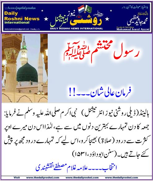 ہالینڈ(ڈیلی روشنی نیو ز انٹرنیشنل) نبی اکرم صلی اللہ علیہ وسلم نے فرمایا: جمعہ کا دن تمہارے بہترین دنوں میں سے ہے، لہٰذا اس دن میرے اوپر کثرت سے درود ( صلاۃ ) بھیجا کرو، اس لیے کہ تمہارے درود مجھ پر پیش کئے جاتے ہیں ۔ (سنن ابوداؤد ،۱۵۳۱)