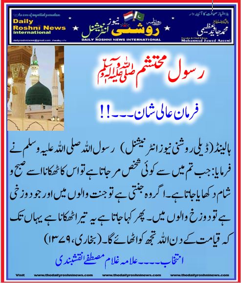 ہالینڈ(ڈیلی روشنی نیو زانٹرنیشنل) رسول اللہ صلی اللہ علیہ وسلم نے فرمایا:جب تم میں سےکوئی شخص مر جاتا ہے تو اس کا ٹھکانا اسے صبح و شام دکھایا جاتا ہے۔اگر وہ جنتی ہے تو جنت والوں میں اور جو دوزخی ہے تو دوزخ والوں میں۔ پھر کہا جاتا ہے یہ تیرا ٹھکانا ہے یہاں تک کہ قیامت کے دن اللہ تجھ کو اٹھائے گا۔ (بخاری، ۱۳۷۹)