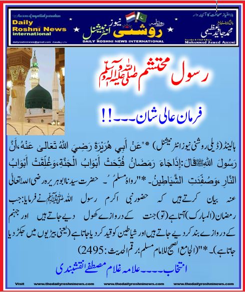ہالینڈ(ڈیلی روشنی نیو زانٹرنیشنل) *”عَنْ أَبِي هُرَيْرَةَ رَضِيَ اللّٰهُ تٙعٙالیٰ عَنْهُ،أَنَّ رَسُولَ اللّٰهِﷺقَالَ:إِذَاجَاءَ رَمَضَانُ فُتِّحَتْ أَبْوَابُ الْجَنَّةِ،وَغُلِّقَتْ أَبْوَابُ النَّارِ،وَصُفِّدَتِ الشَّيَاطِينُ۔”*رواہُ مسلمُُ۔ حضرت سیدنا ابوہریرہ رضی اللّٰہ تعالیٰ عنہ بیان کرتےہیں کہ حضورنبی اکرم رسول اللہﷺنےفرمایا:جب رمضان(المبارک)آتاہے(تو)جنت کےدروازےکھول دیےجاتےہیں اورجہنم کےدروازےبندکردیے جاتےہیں اور شیاطین کوقیدکردیاجاتاہے(یعنی بیڑیوں میں جکڑ دیا جاتا ہے)۔”* (الجامع الصحیح للامام مسلم؛رقم الحدیث:2495)