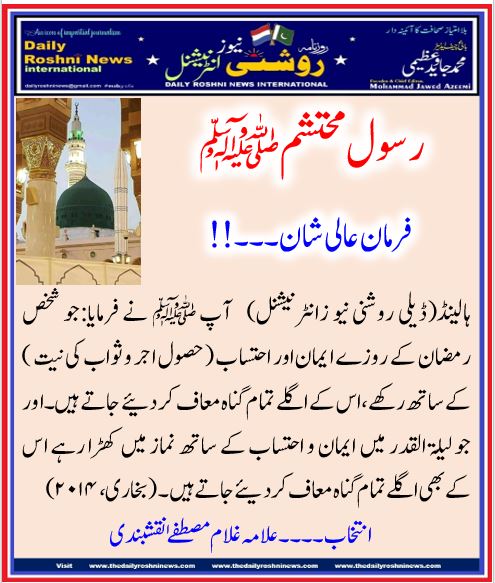 ہالینڈ(ڈیلی روشنی نیو زانٹرنیشنل) ‏آپ ﷺ نے فرمایا:‏جو شخص رمضان کے روزے ایمان اور احتساب ( حصول اجر و ثواب کی نیت ) کے ساتھ رکھے،اس کے اگلے تمام گناہ معاف کر دئیے جاتے ہیں۔اور جو لیلۃ القدر میں ایمان و احتساب کے ساتھ نماز میں کھڑا رہے اس کےبھی اگلے تمام گناہ معاف کر دیئے جاتے ہیں۔‏(بخاری،۲۰۱۴)