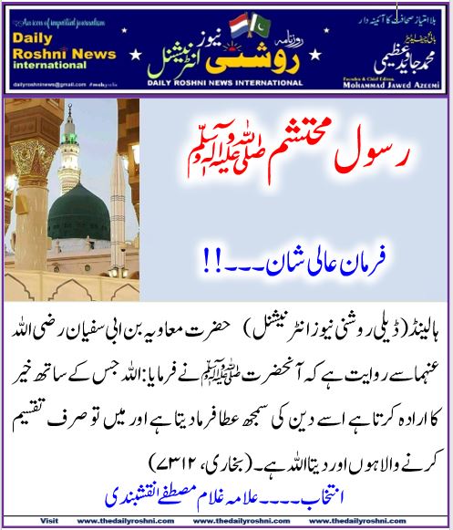 فرمان عالی شان۔۔۔!! / ہالینڈ کی خبریں, فرمان رسول / By Daily Roshni News حضرت معاویہ بن ابی سفیان رضی اللہ عنہما سے روایت ہے کہ آنحضرت ﷺ نے فرمایا: اللہ جس کے ساتھ خیر کا ارادہ کرتا ہے اسے دین کی سمجھ عطا فرما دیتا ہے اور میں تو صرف تقسیم کرنے والا ہوں اور دیتا اللہ ہے۔ (بخاری، ۷۳۱۲)