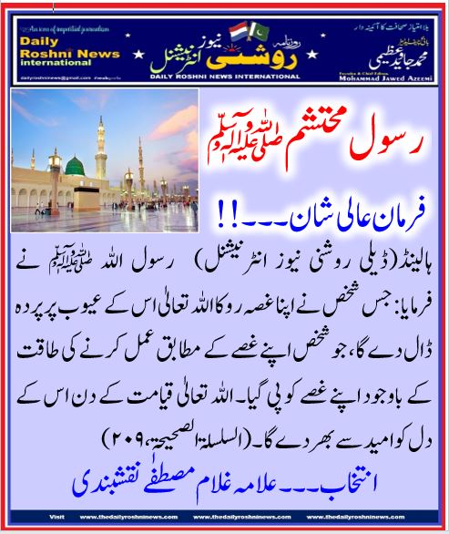 ‏ہالینڈ(ڈیلی روشنی نیوز انٹرنیشنل) رسول اللہ ﷺ نے فرمایا:‏جس شخص نے اپنا غصہ روکا اللہ تعالیٰ اس کے عیوب پر پردہ ڈال دے گا، جو شخص اپنے غصے کے مطابق عمل کرنے کی طاقت کے باوجود اپنے غصے کو پی گیا۔ اللہ تعالیٰ قیامت کے دن اس کے دل کو امید سے بھر دے گا۔‏(السلسلۃ الصحیحۃ ، ۲۰۹)