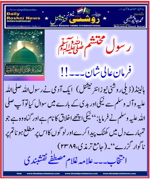 ہالینڈ(ڈیلی روشنی نیوز انٹرنیشنل) ایک آدمی نے رسول اللہ صلی اللہ علیہ وآلہ وسلم سے نیکی اور بدی کے بارے میں سوال کیا تو آپ صلی اللہ علیہ وسلم نے فرمایا: “ نیکی اچھے اخلاق کا نام ہے اور گناہ وہ ہے جو تمہارے دل میں کھٹک پیدا کرے اور لوگوں کا اس پر مطلع ہونا تم پر ناگوار گزرے“ ۔ (جامع ترمذی، ۲۳۸۹)