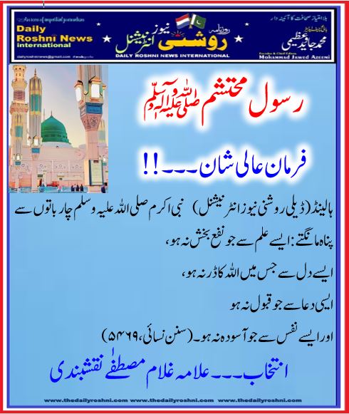 فرمان عالی شان ۔۔۔!! / ہالینڈ کی خبریں, فرمان رسول / By Daily Roshni News ہالینڈ(ڈیلی روشنی نیوز انٹرنیشنل) نبی اکرم صلی اللہ علیہ وسلم چار باتوں سے پناہ مانگتے :ایسے علم سے جو نفع بخش نہ ہو، ایسے دل سے جس میں اللہ کا ڈر نہ ہو، ایسی دعا سے جو قبول نہ ہو اور ایسے نفس سے جو آسودہ نہ ہو ۔(سنن نسائی، ۵۴۶۹)