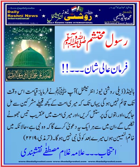 ہالینڈ(ڈیلی روشنی نیوز انٹرنیشنل(آپ ﷺنےفرمایا:قیامت اس وقت تک قائم نہیں ہو گی یہاں تک کہ میری امت کےکچھ قبیلے مشرکین سے مل جائیں،اور بتوں کی پرستش کریں،اور میری امت میں عنقریب تیس جھوٹے نکلیں گے،ان میں سےہر ایک یہ دعویٰ کرے گاکہ وہ نبی ہے،حالانکہ میں خاتم النبیین ہوں میرےبعد کوئی نبی نہیں ہو گا۔(ترمذی،۲۲۱۹)