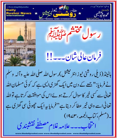 ہالینڈ(ڈیلی روشنی نیوز انٹرنیشنل(رسول اللہ صلی اللہ علیہ وآلہ وسلم نے فرمایا:” جمعے کے دن میں ایک گھڑی ایسی ہے کہ کو ئی مسلمان اللہ تعالیٰ سے کسی خیر کا سوال کرتے ہو ئے اس کی موافقت کرتا ہے تو اللہ تعا لیٰ اسے وہی خیر عطا کر دیتا ہے”فرمایا یہ ایک چھوٹی سی گھڑی ہے ۔(مسلم،کتاب الجمعہ ،۱۹۷۳)