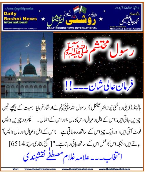 ہالینڈ(ڈیلی روشنی نیوز انٹرنیشنل) رسول اللہ ﷺ نے ارشاد فرمایا: میت کے پیچھے تین چیزیں جاتی ہیں: اس کے اہل و عیال، اس کا مال، اور اس کے اعمال۔  پھر دو چیزیں واپس لوٹ آتی ہیں، اور ایک چیز اس کے ساتھ رہ جاتی ہے:  اس کے اہل و عیال اور مال واپس آ جاتے ہیں،  جبکہ اس کا عمل اس کے ساتھ باقی رہتا ہے۔” [صحیح بخاری، ح: 6514]