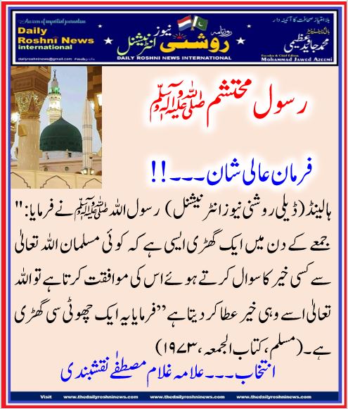 ہالینڈ(ڈیلی روشنی نیوز انٹرنیشنل) رسول اللہ ﷺ نے فرمایا:” جمعے کے دن میں ایک گھڑی ایسی ہے کہ کو ئی مسلمان اللہ تعالیٰ سے کسی خیر کا سوال کرتے ہو ئے اس کی موافقت کرتا ہے تو اللہ تعا لیٰ اسے وہی خیر عطا کر دیتا ہے”فرمایا یہ ایک چھوٹی سی گھڑی ہے ۔(مسلم،کتاب الجمعہ ،۱۹۷۳)