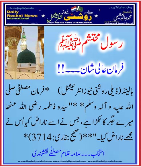 فرمان عالی شان ۔۔۔!! / ہالینڈ کی خبریں, فرمان رسول / By Daily Roshni News ہالینڈ(ڈیلی روشنی نیوز انٹرنیشنل) *فرمان مصطفیٰ صلى الله عليه و آلہ وسلم* *”سیدہ فاطمہ رضی اللہ عنھا میرے جگر کا ٹکڑا ہے، جس نے اسے ناراض کیا اُس نے مجھے ناراض کیا۔”* *(صحیح بخاری:3714)*