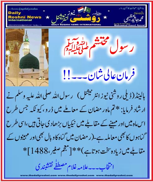 ہالینڈ(ڈیلی روشنی نیوز انٹرنیشنل) رسول اللہ صلی اللہ علیہ وسلم نے ارشاد فرمایا: *تم ماہ رمضان کے معاملے میں ڈرو ،کیونکہ جس طرح اس ماہ میں اور مہینے کے مقابلے میں نیکیاں بڑھا دی جاتی ہیں ، اسی طرح گناہوں کا بھی معاملہ ہے ـ ( رمضان میں گناہ کا وبال بھی اور مہینوں کے مقابلے میں زیادہ سخت ہوتا ہے)* *[معجم صغیر ، 1488]*