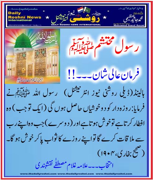 فرمان عالی شان ۔۔۔!! / ہالینڈ کی خبریں, فرمان رسول / By Daily Roshni News ہالینڈ(ڈیلی روشنی نیوز انٹرنیشنل) رسول اللہ ﷺنے فرمایا:روزہ دار کو دو خوشیاں حاصل ہوں گی ( ایک تو جب ) وہ افطار کرتا ہے تو خوش ہوتا ہے اور ( دوسرے ) جب وہ اپنے رب سے ملاقات کرے گا تو اپنے روزے کا ثواب پا کر خوش ہو گا۔ (صحیح بخاری، ۱۹۰۴)