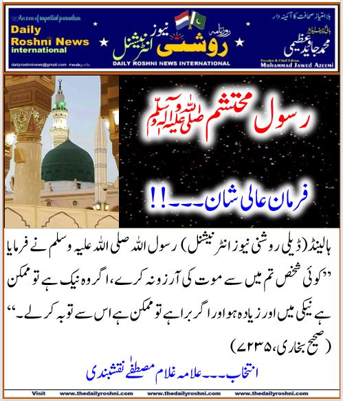 ہالینڈ(ڈیلی روشنی نیوز انٹرنیشنل) رسول اللہ صلی اللہ علیہ وسلم نے فرمایا‏ ”کوئی شخص تم میں سے موت کی آرزو نہ کرے، اگر وہ نیک ہے تو ممکن ہے نیکی میں اور زیادہ ہو اور اگر برا ہے تو ممکن ہے اس سے توبہ کر لے۔“ ‏(صحیح بخاری، ۷۲۳۵)