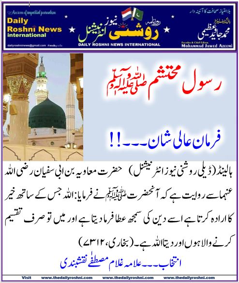 ہالینڈ(ڈیلی روشنی نیوز انٹرنیشنل) حضرت معاویہ بن ابی سفیان رضی اللہ عنہما سے روایت ہے کہ آنحضرت ﷺ نے فرمایا:اللہ جس کے ساتھ خیر کا ارادہ کرتا ہے اسے دین کی سمجھ عطا فرما دیتا ہے اور میں تو صرف تقسیم کرنے والا ہوں اور دیتا اللہ ہے۔(بخاری، ۷۳۱۲)
