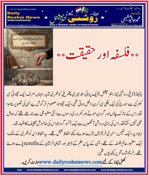 سو، وہ عالم تو اپنے فلسفے کی کتابوں میں مگن رہا اور اپنے آپ کو ایک محبت کرنے والا شخص سمجھتا رہا۔ لیکن وہ معصوم خرگوش، اس کے جھوٹے عمل کی زنجیروں میں جکڑا، خاموشی سے روتا رہا، جہاں دیوار پر لکھا ہوا سچ، اس کے مالک کے ہر روز کے عمل کو خاموشی سے چیلنج کرتا رہا۔
