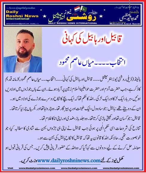 ہالینڈ(ڈیلی روشنی نیوز انٹرنیشنل ۔۔۔ قابیل اور ہابیل کی کہانی ۔۔۔ انتخاب  ۔۔۔۔ میاں عاصم محمود)زمانہ قدیم کا ذکر ہے، جب حضرت آدم اور حضرت حوا علیہما السلام زمین پر آباد ہوئے۔ ان کے ہاں جوڑوں میں اولادیں ہوئیں، ہر بار ایک لڑکا اور ایک لڑکی۔ اللہ کا حکم تھا کہ ایک بچے کا نکاح دوسرے جوڑے کی اولاد میں ہو۔