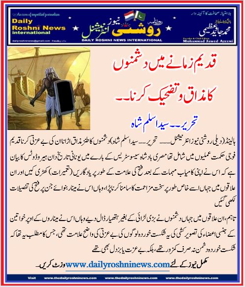 ہالینڈ(دیلی روشنی نیوز انٹرنیشنل )دشمنوں کا طنز مذاق اڑانا ان کی بے عزتی کرنا قدیم فوجی حکمت عملیوں میں شامل تھا مصری بادشاہ سیسوسٹریس کے بارے میں یونانی تاریخ دان ہیروڈوٹس کا بیان ہے کہ اس نے اپنی کامیاب مہمات کے بعد فتح کی علامت کے طور پر یادگاریں (تعمیرات) کھڑی کیں اور ان علاقوں میں جہاں اسے خاص طور پر سخت مزاحمت کا سامنا کرنا پڑا، وہاں اس نےمینار بنوائے جن پر فتح کی تفصیلات لکھی گئیں