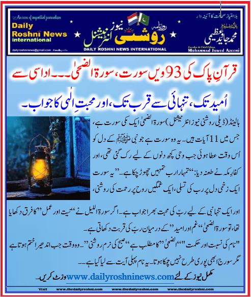 ہالینڈ(ڈیلی روشنی نیوز انٹرنیشنل )سورۃ الضحیٰ ایک مکی سورت ہے، جس میں 11 آیات ہیں۔ یہ وہ سورت ہے جو نبی ﷺ کے دل کو اُس وقت عطا ہوئی جب وحی کچھ دنوں کے لیے رک گئی تھی، اور کفارِ مکہ نے طعنہ دیا: “تمہارا رب تمہیں چھوڑ چکا ہے۔” یہ سورت ایک زخمی دل پر رب کی تسلی، ایک غمگین روح پر رحمت کی روشنی، اور ایک تنہا نبی کے لیے ربّ کی محبت بھرا جواب ہے۔ اگر سورۃ اللیل نے “نیت اور عمل” کا فرق دکھایا تھا، تو سورۃ الضحیٰ “غم اور امید” کے درمیان ربّ کی قربت دکھاتی ہے۔