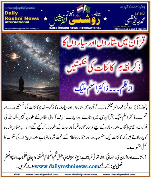 ہالینڈ(ڈیلی روشنی نیوز انٹرنیشنل ۔۔۔ قرآن میں ستاروں اور سیاروں کا ذکر – نظامِ کائنات کی حکمتیں۔۔۔ از قلم۔۔۔ ڈاکٹر اسلم علیگ)قرآنِ مجید میں ستارے اور سیارے صرف آسمانی مظاہر کے طور پر نہیں بلکہ اللہ کی قدرت، نظامِ کائنات، اور انسان کے لیے تدبر و غور و فکر کی دعوت کے طور پر ذکر کیے گئے ہیں۔ یہ مظاہر انسان کو یاد دلاتے ہیں کہ کائنات ایک منصوبہ بند اور متوازن نظام کے تحت چل رہی ہے، اور ہر چیز اللہ کی حکمت کا عملی مظہر ہے۔