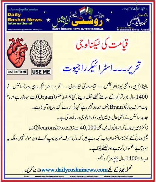 ہالینڈ(ڈیلی روشنی نیوز انٹرنیشنل۔۔۔ قیامت کی ٹیکنالوجی۔۔۔ تحریر: اسٹرائیکر راجپوت )سائنس نے 1400 سال بعد قرآن کے سامنے گھٹنے ٹیک دیئے. کیا ہم غلط عضو (Organ) سے سوچ رہے ہیں؟ بات صرف دماغ (Brain) تک محدود نہیں ہے، کہانی اس سے کہیں زیادہ گہری ہے۔