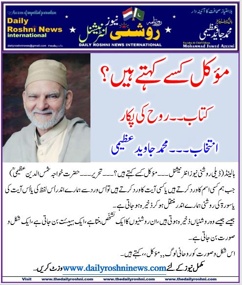 ہالینڈ(ڈیلی روشنی نیوز انٹرنیشنل ۔۔۔ مؤکل کسے کہتے ہیں ؟۔۔۔ تحریر۔۔۔حضرت خواجہ شمس الدین عظیمی ؒ) جب ہم کسی اسم کا ورد کرتے ہیں یا کسی آیت کا ورد کرتے ہیں تو اُس ورد سے ہمارے اندر اُس لفظ کی یا اُس آیت کی یا سورۃ کی روشنی ہمارے اندر منتقل ہو کر ذخیرہ ہو جاتی ہے ۔