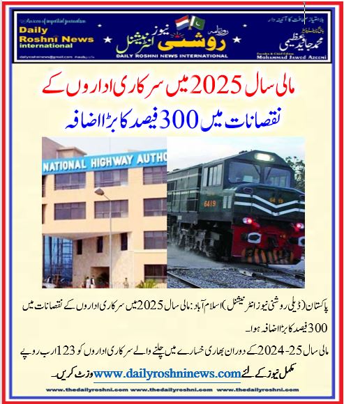 پاکستان(ڈیلی روشنی نیوز انٹرنیشنل )اسلام آباد: مالی سال 2025 میں سرکاری اداروں کے نقصانات میں 300 فیصد کا بڑا اضافہ ہوا۔