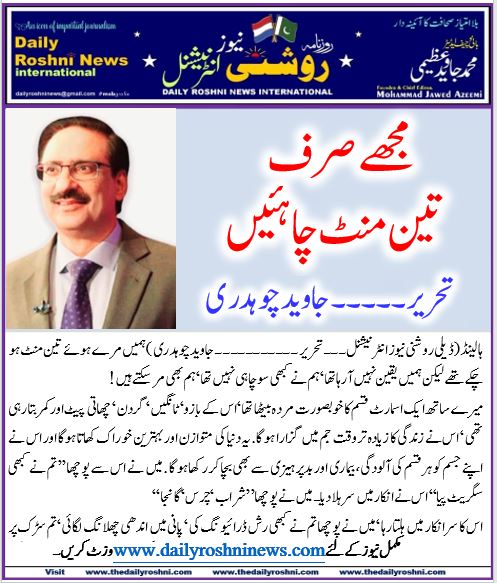 اس نے میری طرف دیکھا اور بولا ’’ تین منٹ کی زندگی!! میں صرف تین منٹ کے لیے واپس جانا چاہتا ہوں. میرے والد میرے ساتھ خفا تھے، میں اپنی بیوی سے بدتمیزی کرتا تھا، میں نے اپنے بچوں کو کبھی پیار نہیں کیا، میں ملازموں کو وقت پر تنخواہ نہیں دیتا تھا اور میں نے اپنے لان میں گلاب کے پھول لگوائے تھے لیکن میں ان کے پاس نہ بیٹھ سکا. میں نے ہمیشہ اپنے جسم کو اللہ تعالیٰ کی کبریائی سے مقدم رکھا. میں تین منٹ میں سب سے معافی مانگنا چاہتا ہوں اور میں اپنے گلابوں کو چھو کر دیکھنا چاہتا ہوں‘‘