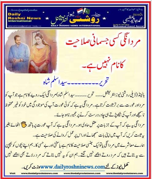 ہالینڈ(ڈیلی روشنی نیوز انٹرنیشنل )مردانگی ایک رویے کا نام ہے جو آپ کو مرد اور عورت سے برتر ثابت کرتا ہے۔مردانگی یہ ہے کہ کوئی عورت آپ کی موجودگی میں خود کو غیر محفوظ نا سمجھے اور آپ کی نگاہ پڑتے ہی چادر درست کرنے پر مجبور نا ہو جائے۔