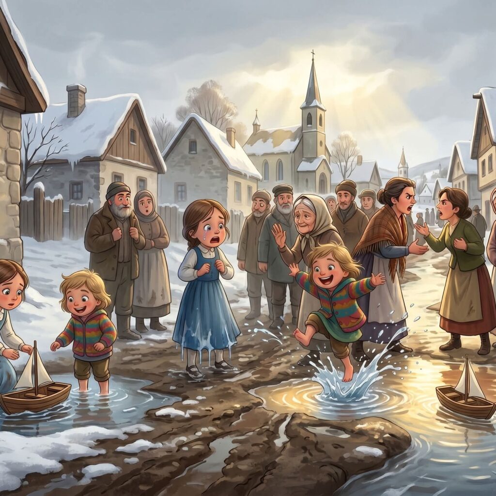 اکولیا بڑی تھی اور مالاشا چھوٹی۔ دونوں نے اپنے جوتے اتار کر ایک طرف رکھ دیے اور پگھلے پانی کے ایک بڑے سے تالاب میں کھیلنے لگیں۔ اکولیا نے مالاشا کو سختی سے کہا، “دھیان سے کھیلنا! میرے نئے کپڑوں پر پانی مت چھڑک دینا!”