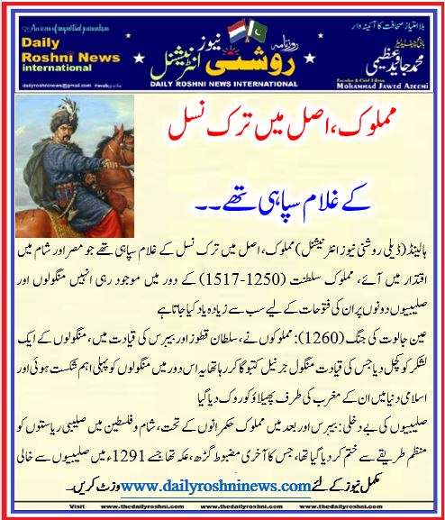 ہالینڈ(ڈیلی روشنی نیوز انٹرنیشنل)مملوک، اصل میں ترک نسل کے غلام سپاہی تھے جو مصر اور شام میں اقتدار میں آئے، مملوک سلطنت (1250-1517) کے دور میں موجود رہی انہیں منگولوں اور صلیبیوں دونوں پر ان کی فتوحات کے لیے سب سے زیادہ یاد کیا جاتا ہے