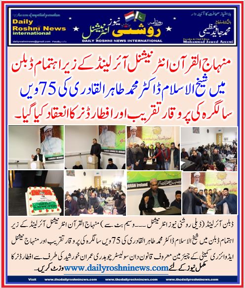 ڈبلن آئرلینڈ (ڈیلی روشنی نیوز انٹرنیشنل ۔۔۔وسیم بٹ سے ) منہاج القرآن انٹرنیشنل آئرلینڈ کے زیر اہتمام ڈبلن میں شیخ الاسلام ڈاکٹر محمد طاہر القادری کی 75ویں سالگرہ کی پر وقار تقریب اور منہاج نیشنل ایڈوائزری کمیٹی کے چیئرمین معروف قانون دان سولیسٹر چوہدری عمران خورشید کی طرف سے افطار ڈنر کا انعقاد کیا گیا جس میں منہاج القرآن آئرلینڈ کے رفقاء و اراکین مختلف شعبہ ہے زندگی سے تعلق رکھنے والی اہم شخصیات کے علاوہ کمیونٹی نے کثیر تعداد میں شرکت کی افطار ڈنر اور نماز مغرب کی ادائیگی کے بعد تقریب کا آغاز حافظ سعید بھٹی نے تلاوت قرآن پاک سے کیا حضور نبی کریمؐ کی بارگاہ اقدس میں ڈاکٹر گلزار احمد نے گلہائے عقیدت پیش کیے جبکہ نقابت کے فرائض وسیم بٹ نے ادا کیے ۔