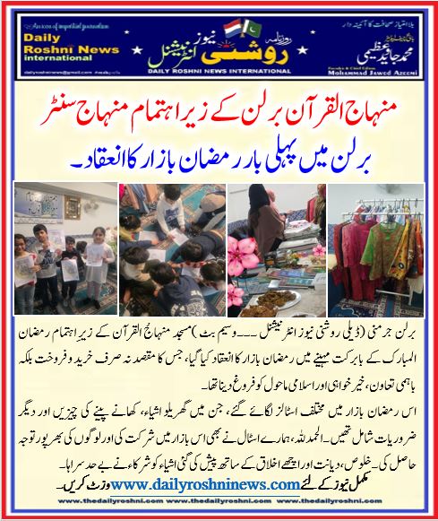 برلن جرمنی (ڈیلی روشنی نیوز انٹرنیشنل ۔۔۔وسیم بٹ )مسجد منہاجُ القرآن کے زیرِ اہتمام رمضان المبارک کے بابرکت مہینے میں رمضان بازار کا انعقاد کیا گیا، جس کا مقصد نہ صرف خرید و فروخت بلکہ باہمی تعاون، خیر خواہی اور اسلامی ماحول کو فروغ دینا تھا۔