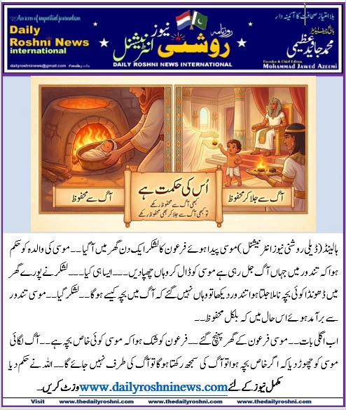 موسی پیدا ہوئے فرعون کا لشکر ایک دن گھر میں آگیا۔۔ موسی کی والدہ کوحکم ہوا کہ تندور میں جہاں آگ جل رہی ہے موسی کو ڈال کر وہاں چھپادیں۔۔۔ ایسا ہی کیا۔۔۔ لشکر نے پورے گھر میں ڈھونڈا کوئی بچہ نا ملا جلتا ہوا تندور دیکھا تو وہاں نہیں گئے کہ آگ میں بچہ کیسے ہوگا۔۔ لشکر گیا۔۔ موسی تندور سے برآمد ہوئے اس حال میں کہ بلکل محفوظ۔۔